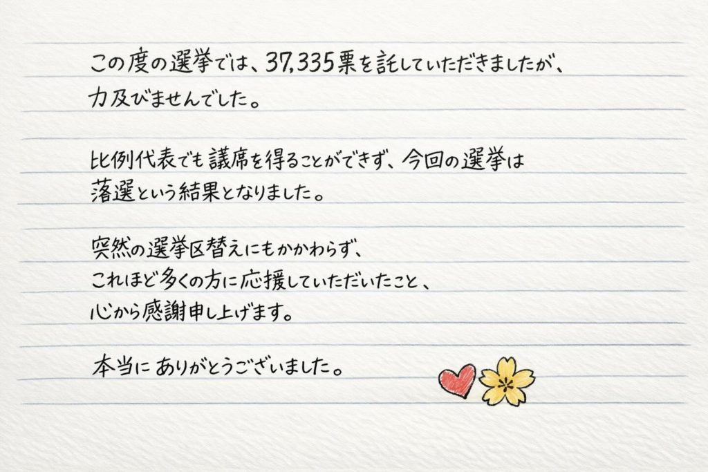お知らせ/活動 本当にありがとうございました 2026年2月9日 by mhiraiwa2 / 0件のコメント この度の選挙では、37,335票を託していただきましたが、力及びませんでした。 比例代表でも議席を得ることができず、今回の選挙は落選という結果となりました。 突然の選挙区替えにもかかわらず、これほど多くの方に応援していただいたこと、心から感謝申し上げます。 本当にありがとうございました。 #愛知3区#平岩まさき#比例は減税日本・ゆうこく連合